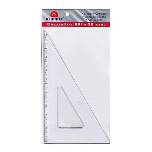 Esquadro em poliestireno, com escala gravada por transferência de imagem, garantindo alta precisão. Possui micro ressaltos na face que entra em contato com o papel para evitar o desgaste da escala.