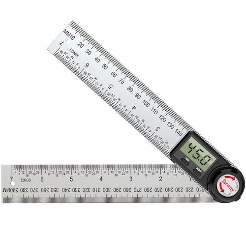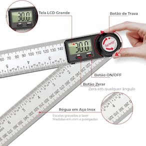 Esquadro Transferidor Angular Digital 2 em 1 360 Graus FarwayEsquadro Angular 2 em 1 para medição de comprimentos e ângulos, internos e externos. Medição de ângulos de alta precisão de 0 a 360. Botão de trava e zeramento para redefinir a ferramenta de localização de ângulo a qualquer momento.- Marca: Farway- Modelo: AM10- Referência: V21251- Marcação de linha e ângulo- Medição de Comprimento- Medição de ângulo externo- Medição de ângulo interno- Comprimento total: 400mm- Mede ângulos até 360 graus- Escala métrica e em polegadas- Multiuso: transferidor de serra de esquadria, verificar o ângulo da lâmina na serra de mesa ou a precisão da serra de esquadria, fazer cortes ou medições de ângulo, medição de ângulo de corte / parede / canto, tubos de dobra e chapas metálicas, etc.- Régua em aço inox- Escala gravada a laser- Precisão 0,3- Resolução 0,1- Faixa de medição: 0 999,9 - Resolução: 0,1 Precisão: 0,3- Temperatura de trabalho: 0 50 Celsius- Umidade de trabalho: =85% RH- Baixo consumo de energia- Botão ligar / desligar- Botão de trava- Bateria: bateria de lítio CR2032 3V incluída - Peso: 230 gramas- Garantia: 90 dias