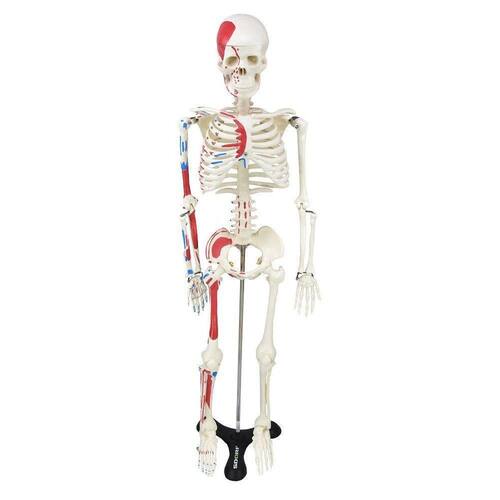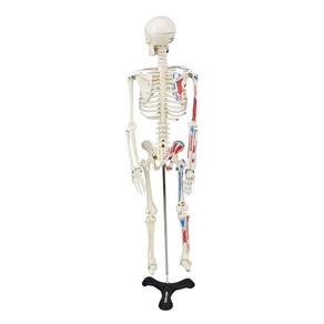 Esqueleto Humano 85 cm de Altura c/, Origens e Inserções Musculares e Haste c/ Suporte SD-5002/C Modelo anatômico de esqueleto humano de 85 cm de altura aproximadamente; Confeccionado em PVC, com pintura feita à mão e cores realísticas, apresenta alta fidelidade anatômica (proporcionais as dimensões naturais); Com origens e inserções Musculares do lado esquerdo (Pintadas em Vermelho e Azul); Composto por todos os ossos, Com o modelo anatômico de esqueleto SD-5002/C podemos identificar do lado esquerdo inserções e origem muscular em cores azul e vermelho respectivamente e é possível identificar os seguintes ossos entre outras estruturas: * Ossos do Crânio (Osso Frontal, Parietal, Nasal, Occipital, Zigomático, Maxilar, Palatino, Temporal, Esfenóide, Etimóide, Vômer, Mandíbula, Dentes extraíveis); * Suturas: Serradas, Escamosas e Planas; Ossos da coluna vertebral: identificação de prolapso entre as vértebras L3/L4); * Vértebras: C1-C7, T1-T12, L1-L5, S1-S5, CO1-CO4; * Ossos do Tórax (Osso esterno, Costelas) * Ossos do Membro superior (Úmero, Ulna, Rádio, Ossos da Mão, Clavícula, Escápula), * Ossos do membro inferior (Fêmur, Patela, Tíbia, Fíbula, Ossos do Pé), * Ossos da Pelve (Ílio, Ísquio, Púbis); * Origens e Inserções dos músculos (Pintados): Cabeça, Pescoço, Tronco, Membro Superior e Membro Inferior.