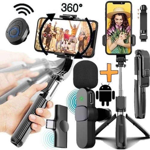kit microfone sem fio tipo c + estabilizador tripé suporte celular