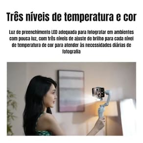 Estabilização Impecável de 3 Eixos Equipado com a 7ª geração de tecnologia de estabilização, o L10 elimina tremores e movimentos indesejados nos eixos Pan, Pitch e Roll, garantindo vídeos incrivelmente suaves e estáveis, mesmo em movimento. Luz de Preenchimento IntegradaA falta de luz não será mais um problema! O L10 possui uma luz de LED embutida com múltiplos níveis de brilho e temperatura, perfeita para garantir a iluminação ideal em qualquer cenário, seja de dia ou de noite. Rastreamento FacialGrave sozinho como se tivesse um cinegrafista particular. O módulo inteligente de rastreamento facial mantém você (ou o objeto escolhido) sempre em foco e centralizado no quadro, de forma automática e precisaCompacto, Dobrável e Pronto para Viagem Leve sua criatividade para qualquer lugar. O design dobrável e o peso de apenas 350g tornam o L10 extremamente portátil. Ele cabe facilmente na sua bolsa ou mochila, e já vem com uma bolsa de transporte e um mini tripé. Bateria de Alta Duração Com uma bateria de longa duração, você tem até 5 horas de gravação contínua para não perder nenhum momento importante. Controle Total e IntuitivoTenha o poder na ponta dos seus dedos. Alterne facilmente entre os modos de gravação, mude da horizontal (paisagem) para a vertical (retrato) com um único toque, controle o zoom com a roda lateral e use o joystick para criar movimentos de câmera perfeitos. Seja para criar conteúdo para redes sociais, gravar vídeos de viagens ou simplesmente registrar momentos especiais com a família, o Gimbal L10 da NOVAVIDA é a ferramenta definitiva para desbloquear todo o potencial da câmera do seu celular.Especificações Técnicas