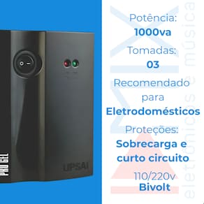 Características: - Potência: 1000VA (700W) - 3 tomadas NBR 14136 - Tempo de comutação: 8 ms - Rendimento > 90% - Proteção contra sobrecarga, curto, surtos e sub/sobretensão - Gabinete metálico aterrado – IP31 - Estabilizador 110V/220V (Bivolt)