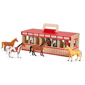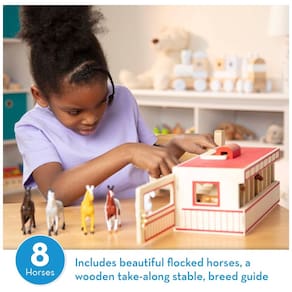 Este conjunto de estábulo para cavalos foi projetado para encantar cavaleiros de todas as idades. Ele contém 8 cavalos de brinquedo, cada um em sua própria baia de madeira com marcas únicas e crachás que permitem às crianças nomeá los e personalizar as baias. A caixa de estábulo é feita de materiais de alta qualidade e montada com padrões de construção duráveis, o que garante sua resistência ao uso constante. Possui uma alça confortável na parte superior para facilitar o transporte. Este conjunto de jogos estável TakeAlong ShowHorse é um excelente presente para crianças a partir de 3 anos e pode ser combinado com o Celeiro Melissa Doug Wooden Fold Go. Melissa Doug tem sido líder em produtos lindamente projetados que estimulam a imaginação e a criatividade por mais de 30 anos. Este conjunto de estábulo para cavalos incentiva o brincar criativo e o aprendizado, oferecendo inúmeras maneiras de brincar.