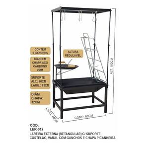 Estação Churrasco Fogo Chão Lareira Picanheira Aço e Varal A Estação Churrasco Fogo Chão Lareira retangular em aço com suporte para costelão e picanheira é um item multifuncional projetado para uso em áreas externas, como quintais, varandas e espaços gourmet. Ela serve tanto para aquecer o ambiente em dias frios quanto para preparar alimentos de forma rústica e saborosa. Com estrutura em aço resistente, suporta altas temperaturas e oferece excelente durabilidade. O suporte para costelão permite o preparo de carnes grandes no estilo fogo de chão, como a costela bovina, garantindo um sabor defumado e tradicional. Já a picanheira possibilita o assado de cortes nobres como a picanha, tornando o equipamento perfeito para churrascos diferenciados. Seu formato retangular amplia a área de cocção e facilita o manuseio dos alimentos. Assim, essa lareira une conforto térmico, funcionalidade e uma experiência gastronômica autêntica, ideal para momentos de lazer e confraternização. Altura regulável da chapa disco. Contém varal com 06 ganchos. Características Técnicas Lareira:Material: Aço Carbono.Comprimento: 63cm.Espessura: 2mm.Largura: 44cm.Altura: 43cm. Características Técnicas Chapa:Diâmetro: 32cm.Alça: Madeira. Características Técnicas Suporte Costelão:Material: Aço Galvanizado.Largura: 43cm.Altura: 70cm. Itens Inclusos:01 Estação Churrasco Fogo Chão Lareira Picanheira Aço e Varal 63x44x43cm.01 Suporte Costelão Aço Galvanizado 70x43cm.01 Chapa Aço Carbono Alça Madeira 32cm.06 Ganchos.01 Varal. Código: LER012OMProdutoLojaPlast. Marca: Não Informado