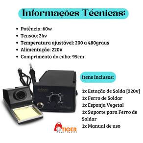 Potência: 60w Tensão: 24v Temperatura ajustável: 200 a 480graus Alimentação: 127v Comprimento do cabo: 95cm