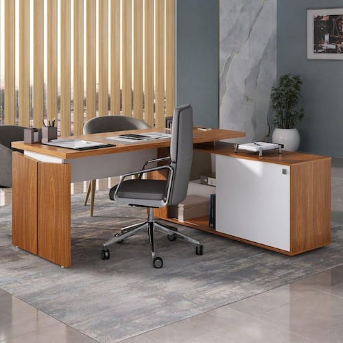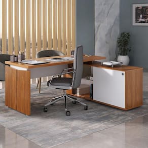 Conta com um revestimento de alta qualidade em BP, o que torna a mesa mais resistente contra riscos e desgaste, proporcionando durabilidade excepcional e suavidade no toque. Invista em um escritório sofisticado e de surpreendente qualidade com esta incrível mesa! Produto Montado: Sim Acabamento do Tampo: BP Acabamento dos Pés: BP Acompanha Manual de Instalação: Sim Ambiente Principal: Escritório codigo_ean: 7909903507650 Complexidade da Montagem: Média: pode ser montado por mais de uma pessoa e/ou necessite de maior conhecimento para montagem Cor: Freijó/Branco Cor do Produto: Freijó/Branco Cor Interna: Branco Dobrável: Não Escala de Brilho: Fosco Espessura do Tampo: 37 mm Formato: Em L Informações Complementares: Caixa de tomada não acompanha a instalação elétrica. Recomendamos a contratação de um eletricista. Itens Inclusos: 1 Mesa, Kit Ferragens e Manual de Montagem Linha ou Coleção: Y37 Manual de Especificação Técnica: https://product-hub-prd.madeiramadeira.com.br/882598/documents/6c9a5fd9-b354-4a4e-8445-86c2ac7882f7caestaogernciaconnectiiy37.pdf Manual de Montagem e Instalação: https://product-hub-prd.madeiramadeira.com.br/882598/documents/b51d6e36-6f86-4f59-b98c-5f185937930fernciaconnectiiy3762946295.pdf Material do Puxador da Porta: Metal Material do Tampo: Tamburato Material dos Pés: MDP Material Principal: Tamburato Montagem Flex: Sim, produto pode ser montado de formada espelhada. Com balcão para o lado direito ou esquerdo, conforme for decidido na montagem Necessita Montagem: Sim Origem do Produto: Nacional Pés Reguláveis: Sim Peso: 78,5 kg Peso Máximo por Prateleira: 10 kg Possui Painel: Não Possui Painel de TV: Não Possui Passa Cabos: 01 Possui Porta Objetos: Sim Possui Portas: Sim Possui Prateleiras: Sim Possui Suporte para Teclado: Não Possui Vidro: Não Quantidade de Nichos: 04 Quantidade de Prateleiras: 02 Prateleiras Recomendações de Uso, Manutenção e Limpeza: Limpar com pano levemente umedecido Sapatas Niveladoras: Sim Sistema de Montagem: Minifix, cavilhas e parafusos Suporta Até (kg): 80 kg Tipo de Dobradiça/Corrediça da Porta: Alumínio