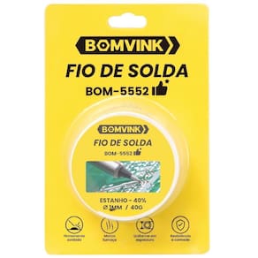 Produto: Estanho em fio para solda espessura de 1 mm 40 g - BOM-5552 Marca: Bomvink Descrição: O Estanho em fio para solda espessura de 1 mm 40 g BOM-5552 da Bomvink é ideal para soldagens de alta qualidade e eficiência. Este produto excepcional combina características avançadas com facilidade de uso, garantindo juntas de solda impecáveis e resistência duradoura em todos os seus projetos eletrônicos e elétricos. Com estrutura composta por 40% de estanho, o fio de solda BOM-5552 inclui breu e fluxo integrados, reduzindo significativamente a emissão de fumaça e a incidência de respingos durante o uso. Além disso, o baixo ponto de fusão facilita uma soldagem rápida e segura, minimizando potenciais danos a componentes delicados. Características: • Juntas de Solda Suaves e Arredondadas: Garante acabamentos mais limpos e profissionais, assegurando forte aderência e longevidade;• Menos Fumaça e Respingos: O uso integrado de breu e fluxo no fio diminui a poluição do ar e oferece um ambiente de trabalho mais limpo e seguro;• Uniformidade em Espessura: A consistência do fio promove aplicações precisas e resultados uniformes em todas as soldagens;• Baixo Ponto de Fusão: Facilita a aplicação rápida, ideal para trabalhos que exigem agilidade e eficácia, reduzindo o risco de danos;• Resistência à Corrosão: Aumenta a durabilidade das juntas soldadas, especialmente em condições ambientais adversas.Especificações: Diâmetro do fio de estanho: 1 mmPercentual de estanho: 40%. Marca: Não Informado
