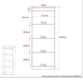 - Não nos responsabilizamos pela montagem dos produtos. Todos os produtos acompanham acessórios para que sejam montados. - Não nos responsabilizamos, no ato da , por subir escadas/elevadores ou por guincho em apartamentos. Eventuais despesas são de responsabilidade do comprador; - Confira as dimensões deste produto e certifique-se de que passará normalmente por supostos elevadores, portas, escadas e/ou corredores de sua residência; - Não aceitamos de produtos com caixas violadas ou materiais danificados, confira a quantidade de volumes e se o que está sendo entregue corresponde com a mercadoria adquirida, não aceitamos após o prazo de arrependimento de 7 dias corridos. Características Gerais do Produto: - Altura: 160,5 cm - Ideal para: Escritório - Informações Adicionais: Cada prateleira suporta até 12 kg - Largura: 60 cm - Material: Estrutura em MDP - Profundidade: 36,5 cm - Acabamento: Acabamento em BP - Prateleiras: 4 Prateleiras - Informações Adicionais: - Não nos responsabilizamos pela montagem dos produtos. Todos os produtos acompanham acessórios para que sejam montados. - Não nos responsabilizamos, no ato da , por subir escadas/elevadores ou por guincho em apartamentos. Eventuais despesas são de responsabilidade do comprador; - Confira as dimensões deste produto e certifique-se de que passará normalmente por supostos elevadores, portas, escadas e/ou corredores de sua residência; - Não aceitamos de produtos com caixas violadas ou materiais danificados, confira a quantidade de volumes e se o que está sendo entregue corresponde com a mercadoria adquirida, não aceitamos após o prazo de arrependimento de 7 dias corridos.