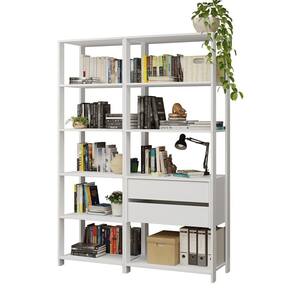 - Duas estantes multiuso com cinco prateleiras com oitro prateleiras e duas gavetas