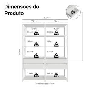 - Duas Estantes Multiuso de 70 cm de largura com quatro prateleiras e duas gavetas em cada