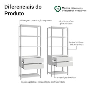 Além disso, o móvel possui um acabamento branco de alta resistência, pés com sapatas plásticas que oferecem proteção contra a umidade e ferragens inclusas para fixação na parede, assegurando maior estabilidade e segurança.