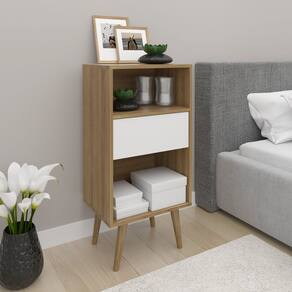 Possui um nicho aberto e uma gaveta para guardar objetos, livros ou itens decorativos, além de pés cônicos em madeira de eucalipto que garantem leveza ao design.