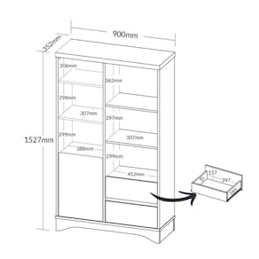 Ela possui tampo em Tamburato 37mm, uma porta, uma prateleira interna com regulagem de altura e duas gavetas