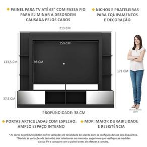 Dimensões do produto montado: Altura: 171cm | Largura: 213cm | Profundidade: 38cm Painel - Altura: 98cm | Largura: 150cm *Devido as variações de tamanho dos televisores no mercado, sugerimos que verifique as medidas da sua TV e compare com o painel antes de efetuar a compra. *Você pode consultar as medidas internas na imagem técnica do produto.