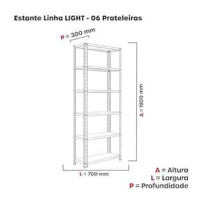 Uma estante com estrutura de aço é uma opção moderna e durável para organizar seus pertences. O aço confere resistência e estabilidade, tornando-a ideal para armazenar livros, objetos decorativos, materiais de escritório e muito mais. Além disso, a estética do aço pode dar um toque contemporâneo ao ambiente. A versatilidade desse material permite que a estante se encaixe em diversos estilos de decoração, do industrial ao minimalista. Acabamento da Prateleira: Pintura Complexidade da Montagem: Baixa: pode ser montado por uma pessoa sozinha Cor: Azul Dali Cor do Produto: Azul Dali Cor Interna: Azul Dali Escala de Brilho: Semi-Fosco Escala de Brilho da Prateleira: Semi-Fosco Itens Inclusos: uma estante Manual de Montagem e Instalação: https://product-hub-prd.madeiramadeira.com.br/901825/documents/94d2d1d6-18c8-4ba4-a3ee-4b59ef43ec6a466Estante2020Linha20Light.pdf Material da Prateleira: Aço Material dos Pés: Polipropileno Material Principal: Aço Necessita Montagem: Sim Origem do Produto: Nacional Peso: 9,0499 kg Peso Máximo por Prateleira: 15 kg Possui Espelho: Não Possui Possui iluminação: Não Possui Pés: 04 Possui Portas: Não Possui Prateleiras: 06 Possui Rodízio: Não Recomendações de Uso, Manutenção e Limpeza: Limpeza deve ser feita com um pano levemente umedecido e um pano seco. Sapatas Niveladoras: Não Sistema de Montagem: Parafuso Suporta Até (kg): 15 kg