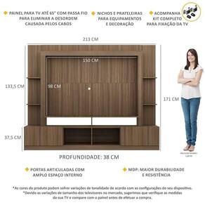 Dimensões do produto montado: Altura: 171cm | Largura: 213cm | Profundidade: 38cm Painel - Altura: 98cm | Largura: 150cm *Devido as variações de tamanho dos televisores no mercado, sugerimos que verifique as medidas da sua TV e compare com o painel antes de efetuar a compra. *Você pode consultar as medidas internas na imagem técnica do produto.