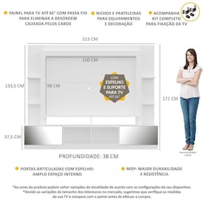 A Estante com Suporte TV 65" Portas c/ Espelho Oslo Multimóveis é perfeita para você deixar seu ambiente organizado e muito bem decorado. Produzida em MDP, que garante maior durabilidade e facilidade na limpeza, além de um acabamento superior, possui 2 portas articuladas com um excelente espaço interno para organizar seus pertences, prateleiras para que você possa personalizar a decoração e nichos para acomodar todos os equipamentos eletrônicos. Os detalhes com espelhos nas portas deixam o móvel mais requintado, criando um ambiente moderno e charmoso. Os espelhos são de vidro (o que evita que a imagem fique distorcida) e lapidados, ou seja, passam por um processo para que as bordas não fiquem cortantes, o que garante maior segurança. O painel com suporte para TV de até 65 (suporta até 30kg) possui espaçamento para passagem dos fios, que permite deixar os cabos mais organizados. Para facilitar a sua vida, este produto acompanha também o kit para fixação da TV. Muito prático e de fácil instalação, pode ser utilizado para TVs LCD, LED e plasma de 14 a 71. Totalmente sobreposto, acompanha gabarito de montagem que auxilia na instalação. Conta com um sistema de encaixe rápido, possui 16mm de deslocamento que permite o ajuste do encaixe das peças.