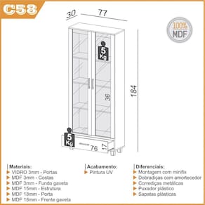 DIMENSÕES: Altura do produto: 184 cm Largura do produto: 77 cm Comprimento do produto: 30 cm Peso líquido: 43,2 kg Peso bruto: 45,0 kg