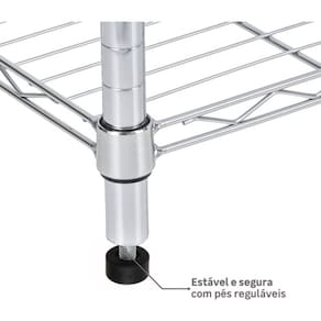 Em resumo, a Estante Utilitaria da Spaceo e uma solucao de armazenamento robusta e elegante, feita de aco cromado, com tres prateleiras que suportam ate 50 kg cada. Ela nao possui gavetas, portas, rodas ou pes, o que a torna versatil para uso em diferentes ambientes. A estante vem desmontada, e facil de montar, e tem uma garantia de 60 meses do fabricante.