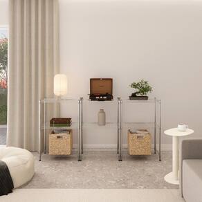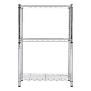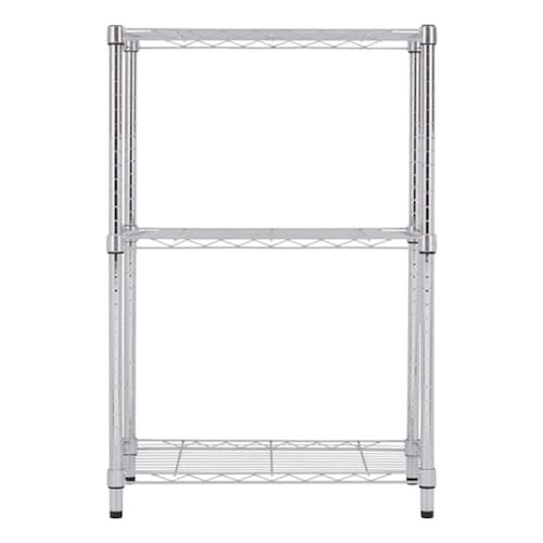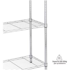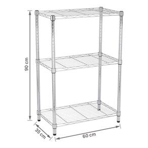 Estante Utilitaria de Metal, feita em Aco cromado com 3 prateleiras. Possui as dimensoes de 90x60x35 cm e suporta ate 150kg de peso total. Indicada para diversos comodos como banheiros, cozinhas, despensas, escritorios, quartos, salas e areas de servico. Acompanha prateleiras com capacidade de peso de 50kg cada. Nao possui gavetas, portas, rodas ou pes. Pesando 14,32 kg, o produto e entregue desmontado e acompanha prateleiras, hastes, pes e suportes meia cana. A marca e Spaceo, da linha Line Aramada, com referencia 60R301-CR e garantia de 60 meses. Seus beneficios incluem versatilidade com design ajustavel, estrutura resistente, estabilidade com pes regulaveis, facil instalacao sem uso de ferramentas e possibilidade de personalizacao com outros componentes da linha Line Aramada.