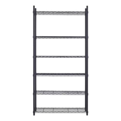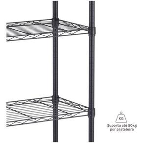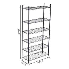 Estante Utilitaria de Metal em Aco, na cor preta, com dimensoes de 180x90x35 cm. Indicada para diversos comodos como banheiros, cozinhas, despensas, escritorios, home office, quartos, salas e areas de servico. Possui 6 prateleiras com capacidade de peso de 50 kg cada e capacidade total de 300 kg. Nao acompanha gavetas, portas, rodas ou pes. Peso do produto na embalagem de 14,32 kg. Marca Spaceo, linha Line Aramada, referencia 90R601-BL. Desmontado, com garantia de 60 meses. Beneficios incluem design ajustavel, estrutura resistente, pes regulaveis, instalacao facil sem ferramentas e possibilidade de personalizacao com outros componentes da linha Line Aramada.