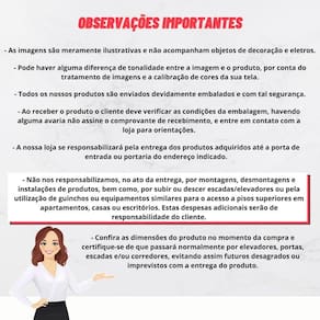 - Confira as dimensões do produto no momento da compra e certifique-se de que passará normalmente por elevadores, portas, escadas e/ou corredores, evitando assim futuros desagrados ou imprevistos com a do produto.