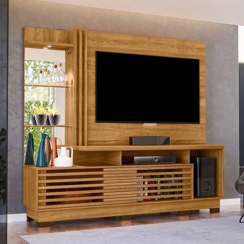 Estante De Tv 60 Pol 200cm Com Pé Sala De Estar Lumari Cumaru M20 - D'rossi A Estante de TV 60 Pol Lumari no tom Cumaru é a escolha ideal para quem deseja aliar design contemporâneo, organização e sofisticação na Sala de Estar. Com 200 cm de largura, este móvel foi desenvolvido para acomodar TVs de até 60 polegadas, oferecendo elegância e funcionalidade em cada detalhe. O destaque fica por conta das portas ripadas deslizantes, que agregam charme ao visual e otimizam o espaço. As prateleiras de vidro e espelhos integrados conferem profundidade e modernidade, enquanto a iluminação em LED embutida cria uma atmosfera aconchegante e sofisticada. Produzida com chapas em MDP de alta resistência e tampo de 40mm, a estrutura garante durabilidade e suporte firme para sua TV e itens decorativos. Os pés reforçam a estabilidade do móvel e facilitam a limpeza, elevando a funcionalidade do produto. Um verdadeiro painel multifuncional que transforma o ambiente com estilo e praticidade. Dimensões do Produto: Altura: 183 cm Largura: 200 cm Profundidade: 46 cm Peso: 82 kg Características do Produto: Material da Estrutura: MDP Espessuras das Chapas: 15mm/25mm/40mm Peso Suportado: 156 Kg Distribuídos Acabamento: Pintura UV Escala de Brilho: Brilho/Fosco Suporta TV de até: 60 Polegadas Possui Prateleiras: Sim Quantidade de Prateleiras: 3 prateleiras, sendo 1 em MDP e 2 em Vidro Material das Prateleiras: Vidro/MDP Possui Portas: Sim Quantidade de Portas: 2 Portas Tipo Porta: Deslizante Possui Nichos: Sm Quantidade de Nichos: 2 Nichos Possui Gavetas: Não possui Possui Puxador: Sim Material do Puxador: Poliestireno Possui Espelho: Sim Quantidade de Espelhos: 3 Espelhos Possui Pés: Sim Material dos Pés: Poliestireno Possui Luminária de LED: Sim Diferenciais: Design moderno; Portas deslizantes; Prateleiras de vidro. Sistema de montagem: Cavilhas/Parafusos/Minifix Manual de Montagem: Sim Complexidade da Montagem: Alta Montagem: Recomendamos que seja feita por um Garantia: 90 dias contra de fabricação Instruções de Limpeza: Utilizar um pano limpo e levemente úmido Quantidade de Volumes 5 Caixas Medida das Embalagens Caixa 1: 49x41x6cm; Caixa 2: 159x39x9cm; Caixa 3: 159x46x10cm; Caixa 4: 204,5x46x7,5cm; Caixa 5: 51,5x10x4cm : É feita somente até o térreo ou portaria. Confira sempre as medidas das embalagens para assegurar que o produto passe por portas e escadas do .