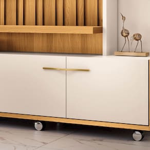 A Estante de TV 60 Pol 200 cm Sam Cinamomo/Off White é uma excelente escolha para quem deseja um móvel com qualidade, funcionalidade e estilo na Sala de Estar. Além de organizar objetos decorativos, ela contribui para a harmonia do ambiente. Seu design marcante apresenta uma autenticidade em ripado com larguras intercaladas, adicionando um toque de sofisticação. Além disso, possui quatro portas com dobradiças laterais e elegantes, puxadores metálicos em tom dourado, conforto, praticidade e espaço para organizar. O nicho lateral, equipado com prateleiras de vidro de 6mm, é perfeito para exibir itens decorativos ou eletrônicos, agregando charme e função. A iluminação LED embutida realça o painel, fornece uma iluminação suave que cria um ambiente aconchegante. Também conta com rodízios cromados de 50mm, que garantem fácil movimento e praticidade. O móvel é fabricado em MDP e MDF, proporcionando alta resistência e durabilidade. O acabamento conta com pintura UV, que protege a superfície contra riscos e desgastes. Gostou? Então garanta a sua agora e transforme seu ambiente com elegância, qualidade e funcionalidade!
