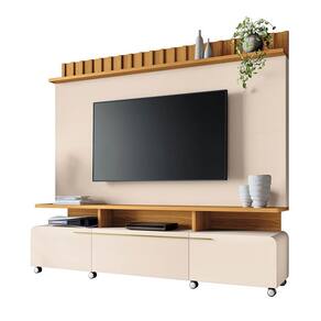 A Estante de TV 70 Pol 200 cm Ripado Jane Off White/Cinamomo é a escolha ideal para compor sua sala de estar, trazendo beleza e exclusividade. Ela foi produzida em MDP e MDF de 25mm e 15mm, materiais de alta qualidade e ecologicamente corretos. Além de um design moderno e funcional a estante conta com; um painel para TV que suporta até 50 polegadas, a estante apresenta tampo e a prateleira superior com espessura de 25mm garantindo maior resistência e durabilidade ao produto, o detalhe ripado na frente é um charme à parte. Possui portas laterais basculantes com dobradiças metálicas e pistão a gás, que abrem e fecham suavemente proporcionando uma flexibilidade silenciosa. Conta também com gaveta central com corrediças telescópicas, que facilitam a abertura e o fechamento e puxadores metálicos em tom dourado conferindo um toque de sofisticação ao móvel. Seus rodízios cromados de 50mm facilitam tanto a movimentação quanto a limpeza. Esta estante foi pensada para o seu lar. Aproveite!
