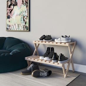 Estante arara com prateleiras e estrutura em madeira maciça de Pinus.