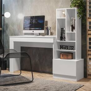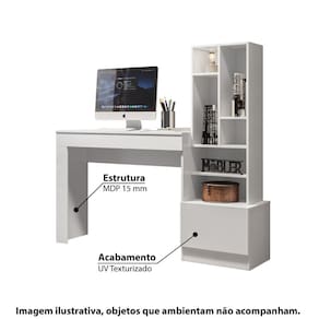 A Estante Escrivaninha é uma estação compacta de trabalho e multifuncional. Um móvel único, com estrutura completa para um escritório organizado, onde todos os objetos podem ser guardados, acomodados de forma prática ao dia-a-dia. Com mesa para o notebook, gaveta para os documentos e nichos para os livros, objetos de decoração e impressora. Conta com 6 nichos e 1 gaveta com muito espaço. Um jeito inteligente compor sua área de estudos e trabalho.