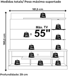 Estante Home Alan, com composição funcional e design moderno que transforma a sua sala. Estrutura em MDP 15/25/40 mm (base 15mm, prateleiras 25mm e tampo 40mm), capacidade para TVs de até 55 polegadas (suporta até 120kg distribuídos). Possui 1 porta basculante com dobradiças metálicas, 2 prateleiras laterais em vidro de 5 mm, 1 prateleira superior com luminária LED embutida e 1 prateleira inferior. Conta ainda com passa-fios central e rodapé integrado. Acabamento em pintura UV texturizada (fosca e brilho). Este móvel chegará separado em 02 volumes.