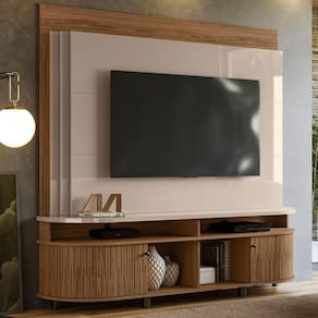 Estante Home Daytona, com design retrô e detalhes que valorizam o seu ambiente. Estrutura em MDP 15/25 mm (base MDP 15 mm e tampo MDP 25 mm) que acomoda TVs de até 65 polegadas (suporta até 65 kg distribuídos). Conta com tampo e base com bordas arredondadas, detalhe em painéis sobrepostos, 2 nichos abertos, 2 portas de correr íveis (em MDF) com frisos vazados e sistema de abertura por trilho plástico, além de 4 pés e puxadores em plástico. Acabamento em pintura UV texturizada (fosca e brilho). Este móvel será entregue em 02 volumes.