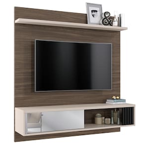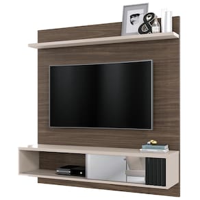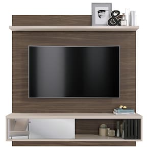 O painel é compacto e ideal para otimizar espaços pequenos. Produzido com MDP, o móvel acomoda uma TV de até 55 polegadas, fixada no painel, e organizada com seus objetos eletrônicos na prateleira.
