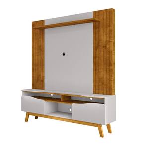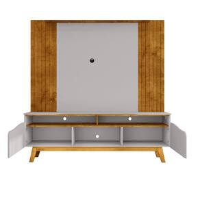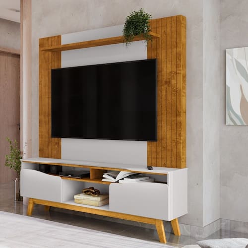Características: Estrutura em MDP e MDF Prateleira superior 25mm 2 Portas Portas com dobradiças metálicas Acabamento pintura em verniz poliéster UV Suporta TV até 75 Polegadas Com detalhe Frisados em MDF de 15mm Com pés de Madeira maciça Prateleiras suporta de 8 á 10kg