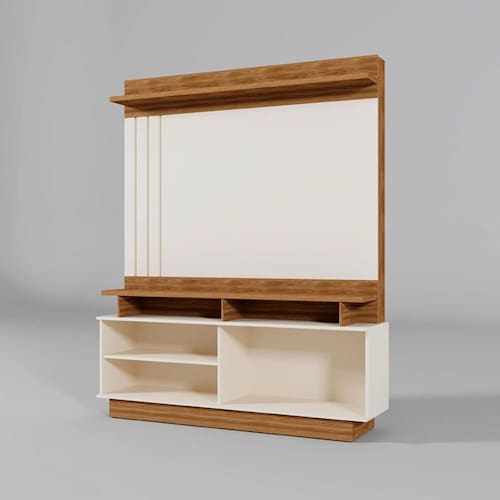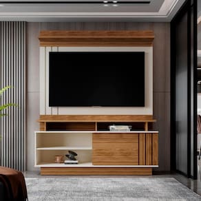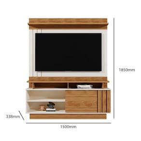 Tampo E Prateleira Superior De 25Mm, Porta De Correr Com Detalhe Ripado, Painel Com Detalhe Ripado, Suporta Tv De Até 55" Cor: 781 Off White/Amendoa Acabamento: PINTURA U.V. Material Principal: MDP Largura:(m) 1,5 Altura:(m) 1,85 Profundidade:(m) 0,338 Peso Suportado: 45KG