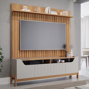 A Estante Home Moema é a combinação perfeita entre o moderno Painel Trend e o funcional Rack Bancada Moema, ideal para transformar sua sala de com estilo e praticidade. A Bancada Moema, feita 100% em MDF, oferece um tampo superior amplo, dois nichos para seus aparelhos eletrônicos e quatro portas que garantem excelente espaço interno para organização. Já o Painel Trend destaca-se pelo seu design ripado, trazendo um toque de sofisticação ao ambiente. Com uma prateleira grande para exibir objetos decorativos e espaço para de até 70, este conjunto é a escolha ideal para quem busca elegante e funcionalidade em um só produto.