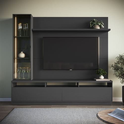 Organização e Praticidade Produto Montado: Sim Acabamento da Porta: Finish Foil Acabamento da Prateleira: Finish Foil Acabamento dos Pés: Finish Foil Acompanha Lâmpada: 01 Ambiente Principal: Sala de Estar codigo_ean: 7900288248589 Complexidade da Montagem: Média: pode ser montado por mais de uma pessoa e/ou necessite de maior conhecimento para montagem Cor: Grafite Cor do Produto: Grafite Cor Flex: não Cor Interna: Grafite Escala de Brilho: Fosco Escala de Brilho da Porta: Fosco Escala de Brilho da Prateleira: Fosco Espessura do Painel: 15 cm Espessura do Tampo: 30 mm Espessura do Vidro: 4 mm Fixação na Parede: Sim Ideal para TVs até (Polegadas): 65 Informações Complementares: Deve ser feita com pano macio e seco ou levemente umedecido com água e sabão neutro. Não devem ser utilizados abrasivos como palha de aço e objetos cortantes. Itens Inclusos: 1 Estante Home e Kit Ferragens Manual de Montagem e Instalação: https://product-hub-prd.madeiramadeira.com.br/759542747/documents/1dadc17f-6041-4ac8-8204-0d8daed361ff325574653821759414853618.pdf Marca: Quiditá Material da Porta: MDP Material da Prateleira: MDP Material dos Pés: MDP Material Principal: MDP Montagem Flex: não Necessita Montagem: Sim Origem do Produto: Nacional Peso: 74 kg Peso Máximo por Prateleira: 5 kg Possui Espelho: Não Possui iluminação: Sim Possui Nichos: 03 Possui Passa Cabos: Sim Possui Pés: Rodapé Possui Portas: Sim Possui Prateleiras: Sim Possui Rodízio: Não Possui Vidro: Sim Recomendações de Uso, Manutenção e Limpeza: Deve ser feita com pano macio e seco ou levemente umedecido com água e sabão neutro. Não devem ser utilizados abrasivos como palha de aço e objetos cortantes. Sapatas Niveladoras: Não Sistema de Montagem: Parafusos,cavilhas e minifix. Suporta Até (kg): 40 kg Suporte de TV Universal Incluso: Não Tipo de Puxador da Porta: Não possui