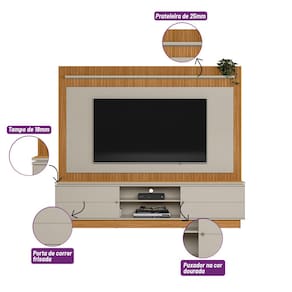 Características: Modelo: Estante Home Ripado Guararapes Espaço para TV no painel: 1,95 x 1,02m x 0,00(LxAxP) Tamanho de TV recomendado no painel : 75 polegadas Espaço para TV no tampo: 1,95m x 1,02m x 0,27m (LxAxP) Tamanho de TV recomendado no tampo : 75 polegadas Nicho: 2 para aparelhos eletrônicos e decoração Porta: 2 portas de correr em MDF com espessura de 15mm. Prateleiras: 2 prateleiras em MDP Puxador: 2 puxadores