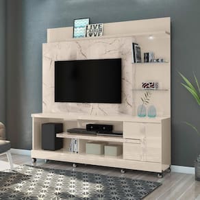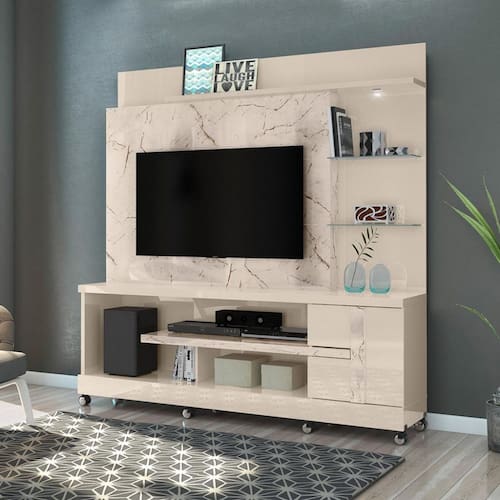 Características: 1 Porta 3 Prateleiras sendo 2 de vidro 5 mm Acabamento pintura UV Dobradiças metálicas Estrutura em MDP luminária de LED Painéis em MDP de 15,25 e40 mm Peso total suportado 120 kg Possui rodizíos Revestimento com pintura DIP Sistema de fixação Girofix Suporte para TV de até 55 polegadas