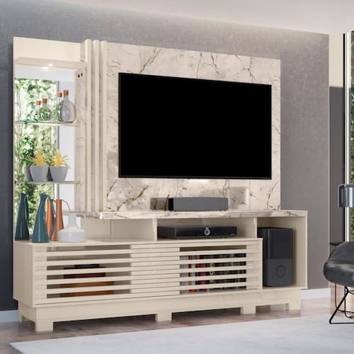 A Estante para TV até 60 Polegadas 2 Portas Fizz Plus da Madetec é elegante e funcional, feita em MDP com acabamento em pintura UV. Ela tem 2 portas deslizantes, 3 prateleiras -2 de vidro de 5 mm-, puxadores cromados, luminárias LED e espelho integrado para ampliar o espaço. Os pés com mini sapata plástica oferecem estabilidade e proteção ao piso, e o sistema de fixação girofix garante a segurança da estrutura.