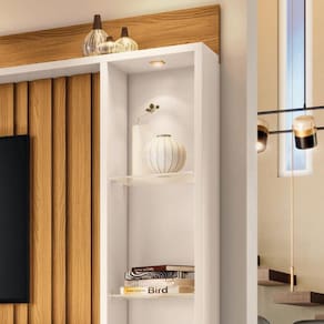 Características: Estrutura em MDP e MDF com espessuras de 40mm, 25mm e 15mm 4 Portas com dobradiças laterais Puxadores metálicos Nicho lateral com prateleiras de vidro 6mm Luminária LED Rodízios cromados de 50mm Sustenta TVs de até 60 polegadas