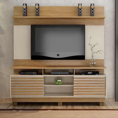 Estante Home Texas Para Até 60 Polegadas 2 Portas 2 Prateleiras E Nichos Cinamomo Com Off White Valdemóveis Sua sala de estar ficara ainda mais linda e com uma decoracao moderna! Conte com o espacoso Home Theater! Confeccionado com materiais de qualidade, ele conta com nichos para voce colocar aparelhos eletronicos, livros e DVDs. As prateleiras sao ideais para colocar objetos de decoracao como vasos e fotografias. Ele comporta de ate 60 polegadas. Bacana, ne? Caracteristicas: Material da Prateleira: MDP Sistema de Montagem: Parafusos e Cavilha. Complexidade da Montagem: Media: pode ser montado por mais de uma pessoa e/ou necessite de maior conhecimento para montagem. Possui Portas: 02 Material do Puxador da Porta: MDP Tipo de Puxador da Porta: Embutido Tipo de Porta: Correr Escala de Brilho da Porta: Fosco Acabamento da Porta: Pintura Material da Porta: MDP Possui Prateleiras: 02 Peso Maximo por Prateleira: 15 kg Escala de Brilho da Prateleira: Fosco Acabamento da Prateleira: Pintura Possui Pes: Nao Possui Vidro: Nao Escala de Brilho: Fosco Ideal para TVs ate (Polegadas): 60 Ambiente Principal: Sala de Estar Possui Nichos: 05 Necessita Montagem: Sim Estilo: Moderno Linha ou Colecao: Texas Possui Espelho: Nao Montagem : Nao Possui Gavetas: Nao Possui iluminacao: Nao Painel para Integrado: Sim Suporta Ate (kg): 50 kg Informacoes Complementares: As TVs podem apresentar variacoes em suas carcacas de acordo com a marca, portanto meca a e veja se a medida do espaco deixado no produto e adaptavel com o aparelho. A deve ser fixada no painel e nunca apoiada sobre o nicho para aparelhos Origem do Produto: Material Principal: MDP Acabamento: Pintura Recomendacoes de Uso, Manutencao e Limpeza: Limpar com pano seco.