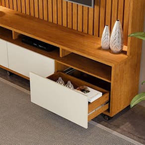 Transforme a sua sala de estar com a Estante Home Absoluto, seu design ripado confere um toque contemporâneo, enquanto a iluminação LED embutida adiciona um brilho envolvente. Com três gavetas, você pode organizar seus itens com facilidade, mantendo a ordem no espaço. As prateleiras proporcionam um local elegante para exibir objetos de decoração.A combinação de materiais premium, como madeira ripada, vidro e iluminação LED, cria um contraste sofisticado que eleva o charme da sua sala. Construída com foco na funcionalidade e estética, o home se adapta harmoniosamente a diversos estilos de decoração. A facilidade de montagem permite que você desfrute rapidamente do novo visual da sua sala. Realce seu espaço de convivência com essa estante versátil, unindo beleza, praticidade e tecnologia. Acabamento da Gaveta: Pintura UV Acabamento da Prateleira: Pintura UV Acompanha Lâmpada: 02 Ambiente Principal: Sala de Estar Complexidade da Montagem: Alta: deve ser montado por um montador especializado Cor: Marromle/Off White Cor do Produto: Marromle/Off White Cor Flex: Não Cor Interna: Marromle Escala de Brilho: Fosco Escala de Brilho da Gaveta: Fosco Escala de Brilho da Prateleira: Fosco Espessura do Vidro: 3 mm Gaveta com Chave: Não Ideal para TVs até (Polegadas): 60 Itens Inclusos: 1 Estante Home , 1 Kit ferragens, 1 Manual de Montagem Manual de Montagem e Instalação: https://product-hub-prd.madeiramadeira.com.br/860418/documents/2f90dbd7-f1ac-437b-98bc-1f13912a6a711447358home1.pdf Material da Gaveta: MDF/MDP Material da Prateleira: MDF/MDP Material Principal: MDF/MDP Montagem Flex: Não Necessita Montagem: Sim Origem do Produto: Nacional Peso: 98,5 kg Peso Máximo por Gaveta: 3 kg Peso Máximo por Prateleira: 3 kg Possui Espelho: Não Possui iluminação: Sim Possui Nichos: 03 Possui Pés: Não Possui Portas: Não Possui Prateleiras: 04 Possui Vidro: Sim Recomendações de Uso, Manutenção e Limpeza: Pano levemente umedecido com agua, seguido de pano seco. Não utilizar produtos quimicos ou abrasivos. Manter o móvel em lugar livre de umidade e ao abrigo de exposição direta ao sol. Sistema de Montagem: Parafusos, Cavilhas, Minifix e Prego Suporta Até (kg): 40 kg Tipo de Corrediça da Gaveta: Metálica Telescópica Tipo de Puxador da Gaveta: Embutido