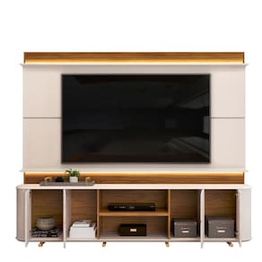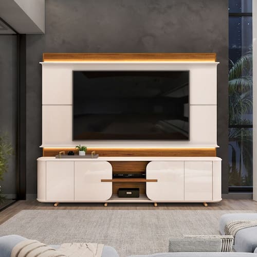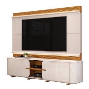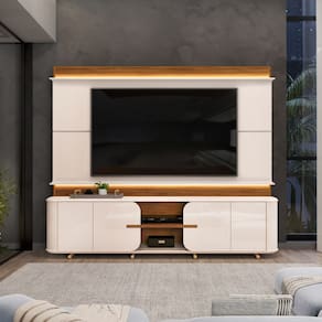 Caracter?sticas: 6 Nichos 8 P?s de metal 4 Portas de giro, sendo duas usinadas 1 Prateleira Acabamento das bordas Melamina / Pu completo Dobradi?as de 35mm com amortecimento Estrutura em MDF Fecho Toque Ideal para TV de at? 75 polegadas Painel com ripado canelado revestido e moldura curva Peso m?ximo que suporta Painel 40 Kg / Bancada 10Kg Possui LED embutido Revestimento impress?o ultravioleta alto brilho e texturizada fosca com 08 camadas Tampo de 25mm chanfrado