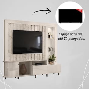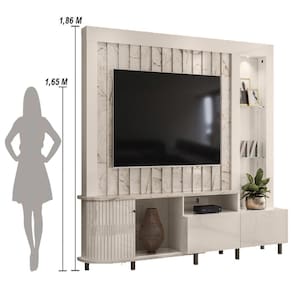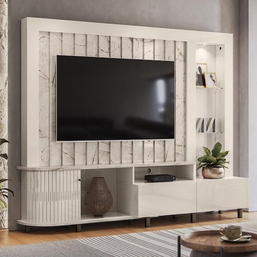 A Estante Home Theater Le Mans é ideal para quem busca qualidade e design, com materiais duráveis e acabamentos modernos, ela combina praticidade e beleza, oferecendo suporte para TVs de até 70 e diversos detalhes que agregam estilo, como portas flexíveis em MDF, puxadores de poliestireno e iluminação LED integrada. Além disso, o design inteligente com prateleira de vidro e gavetas com corrediças telescópicas garante praticidade e organização.