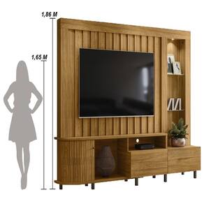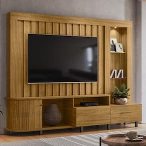 A Estante Home Theater Le Mans é ideal para quem busca qualidade e design, com materiais duráveis e acabamentos modernos, ela combina praticidade e beleza, oferecendo suporte para TVs de até 70" e diversos detalhes que agregam estilo, como portas flexíveis em MDF, puxadores de poliestireno e iluminação LED integrada. Além disso, o design inteligente com prateleira de vidro e gavetas com corrediças telescópicas garante praticidade e organização.