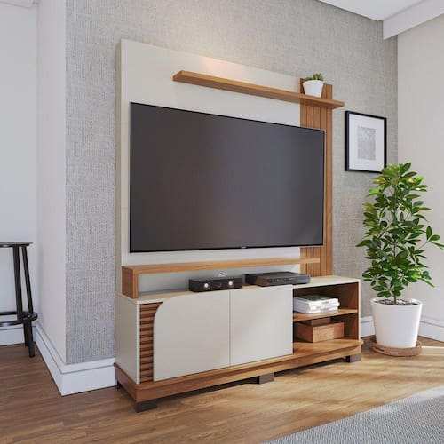 O Home Jurerê combina design retrô e contemporâneo, destacando-se por suas linhas orgânicas. Apliques ripados com 20mm de profundidade e uma porta de quina usinada proporcionam uma marcante sensação de volumetria. Com duas portas de giro e nichos espaçosos, oferece amplo espaço para aparelhos e decorações. A prateleira superior de 25mm é funcional e decorativa. O painel amadeirado possui frisos com acabamento em pintura PU, garantindo durabilidade. Adequado para TVs de até 65 polegadas, o Home Jurerê inclui 06 pés plásticos para montagem opcional, permitindo adaptar-se ao seu estilo. Transforme sua sala com este móvel que harmoniza o retrô e o contemporâneo de maneira única. Acabamento da Porta: Pintura UV Acabamento da Prateleira: Pintura UV Ambiente Principal: Sala de Estar Complexidade da Montagem: Média: pode ser montado por mais de uma pessoa e/ou necessite de maior conhecimento para montagem Cor: Off White Matte / Freijó Cor do Produto: Off White Matte / Freijó Escala de Brilho: Fosco Escala de Brilho da Porta: Fosco Escala de Brilho da Prateleira: Fosco Ideal para TVs até (Polegadas): 65 Informações Complementares: Suporta até 30 Kg no Painel Itens Inclusos: 1 Estante Home Theater, Kit Ferragens e Manual de Montagem Manual de Especificação Técnica: https://product-hub-prd.madeiramadeira.com.br/877820/documents/0dc924c6-3d5a-4778-9fcf-967e1931180d1643079croqui2634.pdf Manual de Montagem e Instalação: https://product-hub-prd.madeiramadeira.com.br/877820/documents/cba28e5f-047e-422a-98e4-39f0e557d20f1643078manual2634.pdf Material da Porta: MDP Material da Prateleira: MDP Material dos Pés: Plástico Material Principal: MDP Necessita Montagem: Sim Origem do Produto: Nacional Peso: 58.2 Peso Máximo por Prateleira: 3 Possui Espelho: Não Possui iluminação: Não Possui Nichos: 02 Possui Pés: 06 Possui Portas: 02 Possui Prateleiras: 03 Possui Rodízio: Não Recomendações de Uso, Manutenção e Limpeza: Limpar utilizando apenas pano umedecido com água, nunca utilizar abrasivos ou esponjas de aço. Sapatas Niveladoras: Não Sistema de Montagem: Cavilhas, Parafusos e Cola Suporta Até (kg): 30 Tipo de Porta: Bater Tipo de Puxador da Porta: Embutido