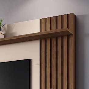 ESPECIFICAÇÕES: Estrutura em MDP e MDF com espessuras de 25mm, 15mm e 12mm Pintura UV 1 Porta basculante com pistão a gás Dobradiças metálicas Puxador em poliestireno com acabamento na cor champanhe Nichos Prateleira inferior removível Prateleira superior de 25mm Detalhe produzido com o autêntico ripado HB Móveis Ideal para TV até 55"