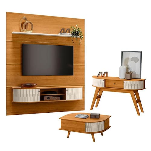 Estante Home Theater com Bancada Suspensa Bugatti com Aparador Estoril e Mesa de Centro Indianápolis Cinamomo Off White – Madetec